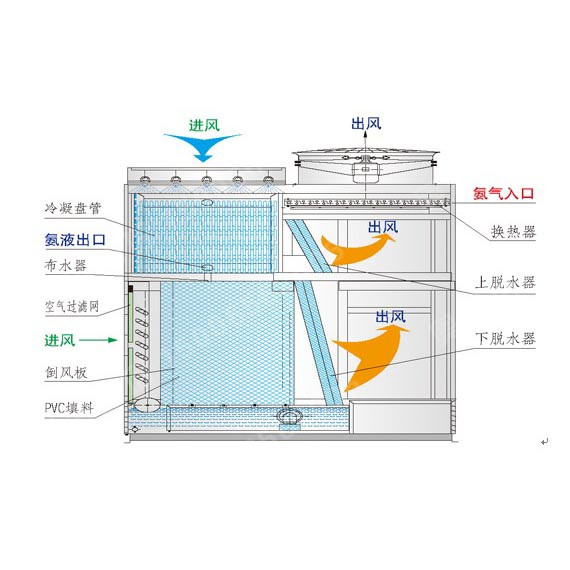 (5)進(jìn) 風(fēng) 系統(tǒng):防陽光、防濺水PVC高效四面進(jìn)風(fēng)格柵。降低噴淋水的外濺現(xiàn)象,有效防止水藻滋生。